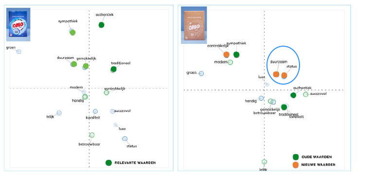 Dat status een interessante associatie is die duurzame verpakkingen weten op te roepen, is een trend die bevestigd wordt door de twee overige studies. Van OMO zie je de resultaten hieronder. Ook hier zie je waarden als 'status' en 'duurzaamheid' aan het nieuwe design gekoppeld worden. Het lijkt erop dat kopers van duurzame producten, of beter gezegd producten in duurzame verpakkingen, zichzelf onbewust ‘beter’ of ‘belangrijker’ vinden dan zij die dit niet doen. “Kijk mij eens goed bezig zijn” lijken ze te willen uitstralen.